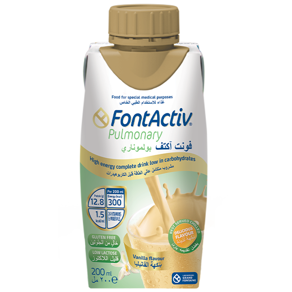 High energy complete oral nutrition drink low in carbohydrates specially designed for patients with pulmonary conditions.